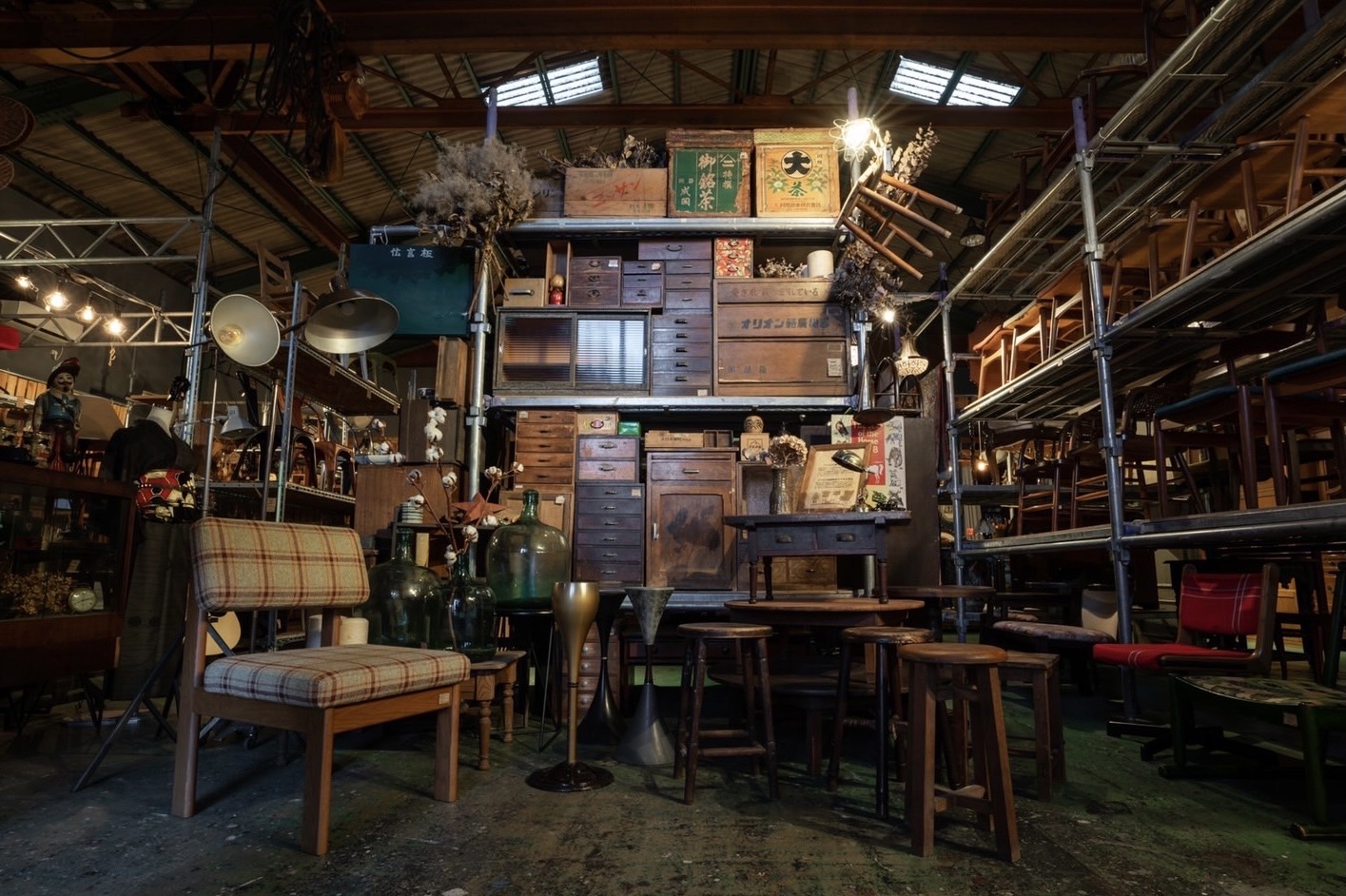 住宅街と工業地帯が混在するこのエリアに、ひときわ異彩を放つ空間がある。店内には、中古家具や雑貨、アンティーク品など1万点以上の商品がずらりと並ぶ。一歩足を踏み入れると、時間を経てきたヴィンテージ品一つひとつが独特のオーラを放ち、まるで宝探しを楽しむようなワクワク感と高揚感に包まれる。