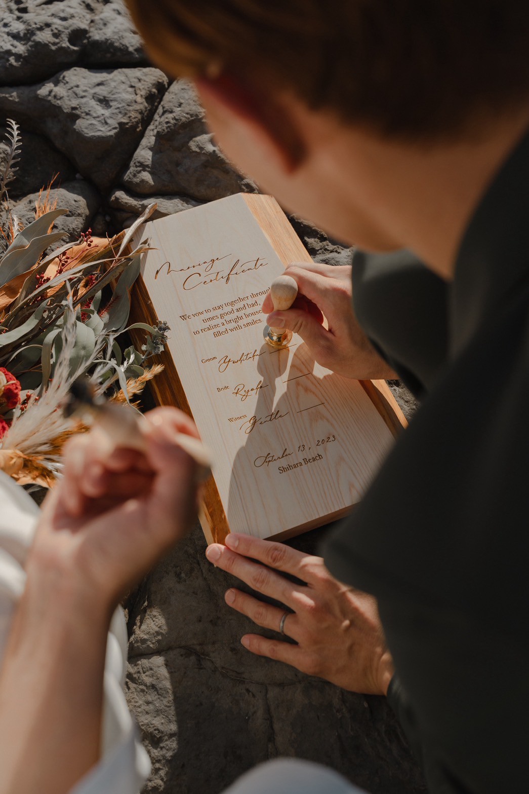 無垢板に文字入れをしてくれる方でね!その無垢版を使って結婚証明書を作ってくれるんだよ!これからの僕たちにピッタリでしょ?